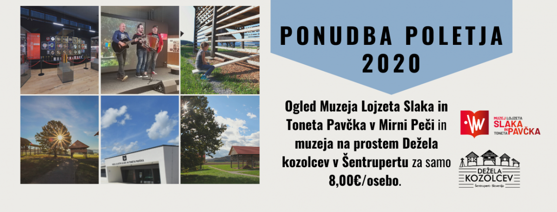 PONUDBA POLETJA 2020 Dragi obiskovalci, v letošnjem poletju, ki je zares posebno, sva se povezala dva mlada dolenjska muzeja – Muzej Lojzeta Slaka in Toneta Pavčka v Mirni Peči in muzej na prostem Dežela kozolcev v Šentrupertu. S skupno vstopnico nas lahko obiščete za samo 8,00€/osebo. Vstopnice so na voljo na obeh lokacijah. Dodatno ponudbo […]